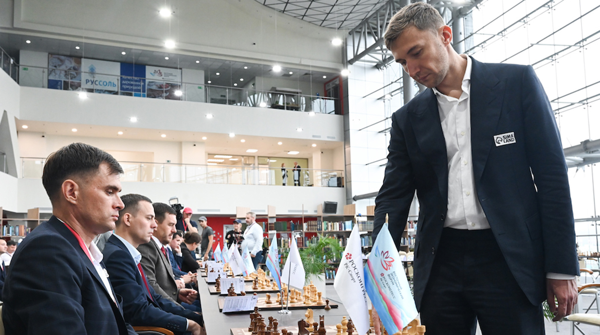 По регламенту сеанса одновременной игры программа будет давать любителям подсказки каждый второй ход. Встреча с Карякиным и Раджабовым пройдет в павильоне, посвященном 100-летию Министерства спорта, на площадке Форума в КВЦ «Экспофорум».