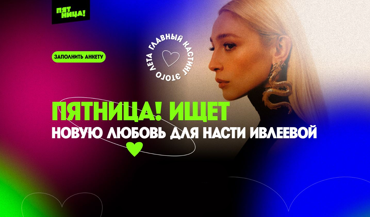 «Сердце Ивлеевой» — грандиозный романтический эксперимент, в котором телеканал «Пятница!» попробует найти новую любовь Насте Ивлеевой. Для участия в проекте со всей страны выберут 50 мужчин разного социального статуса, возраста и профессий. В шоу «Сердце Ивлеевой» попадут только те, кто искренне готов на серьезные отношения.